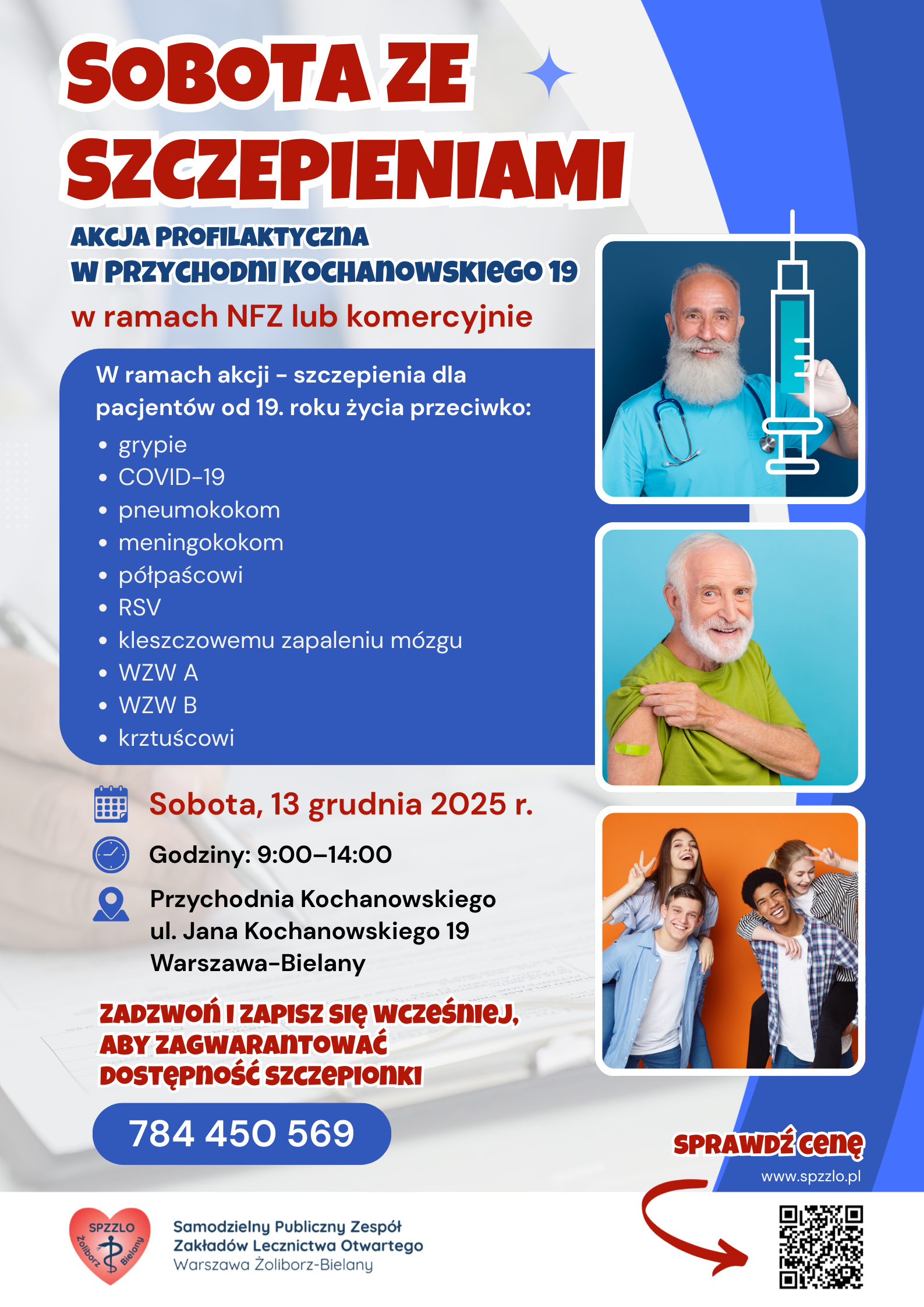 Już w sobotę, 13 grudnia 2025 r., w godzinach 9:00–14:00 zapraszamy do Przychodni Kochanowskiego 19 na specjalną akcję szczepień. W trakcie tej inicjatywy pacjenci od 19. roku życia mogą skorzystać z szerokiego zakresu szczepień ochronnych, zarówno w ramach NFZ, jak i komercyjnie.